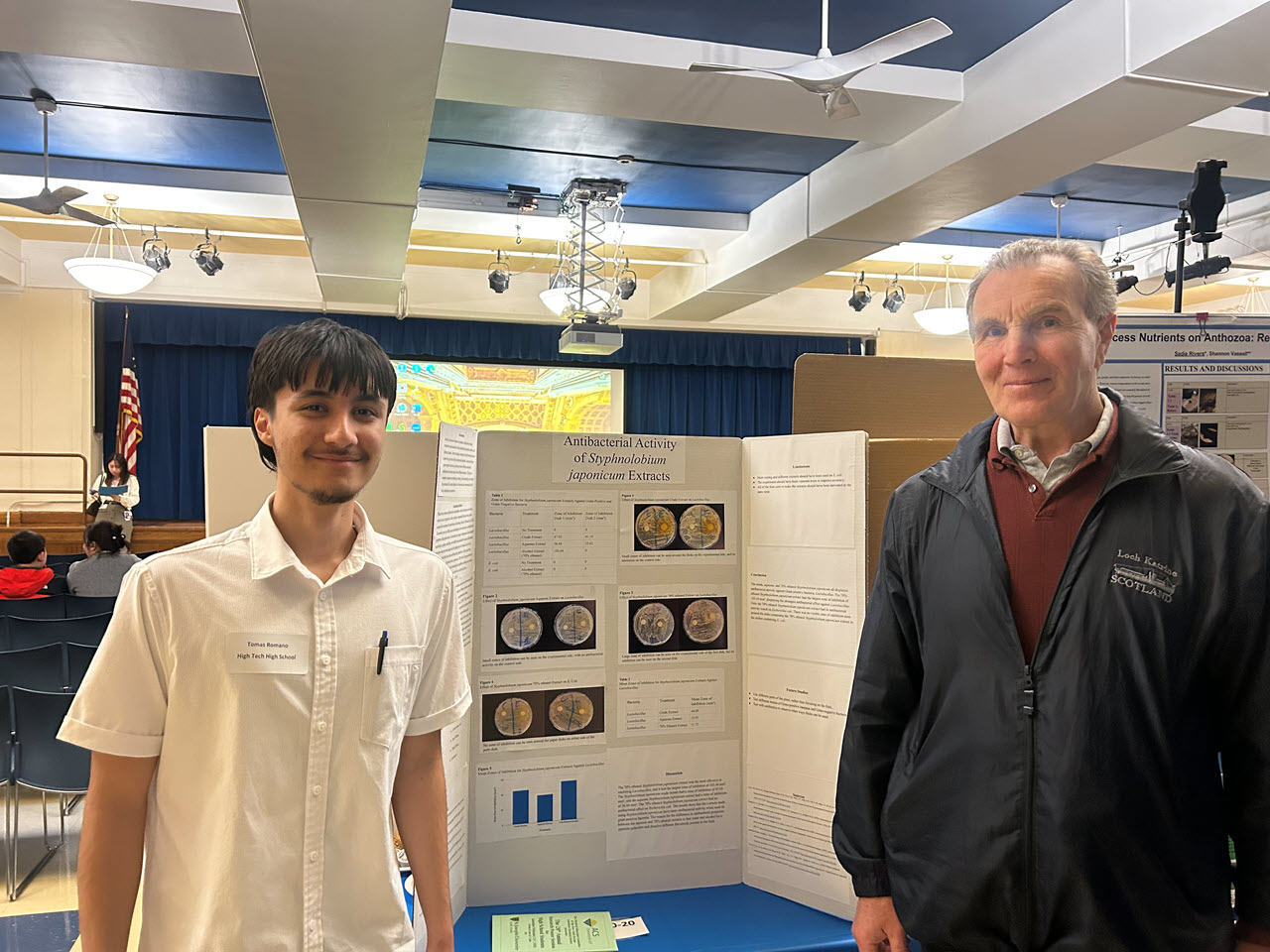 Among them, were our seniors, Kristina Torres, Alaa Sakr, and Tomas Romano. The title of Kristina’s project,Combined Effects of Antibiotics and Natural Remedies. Alaa Sakr conducted her research on Effects of Caffeine Exposure and Cell Cycle. Tomas Romano presented Antibacterial Activity of Stypholonobium japonicum (Pagoda tree) Extracts. All three students performed their experiments in our High Tech High School Lab as a part of the AP Biology course. They worked on it not only during assigned Lab time and in their free time.
