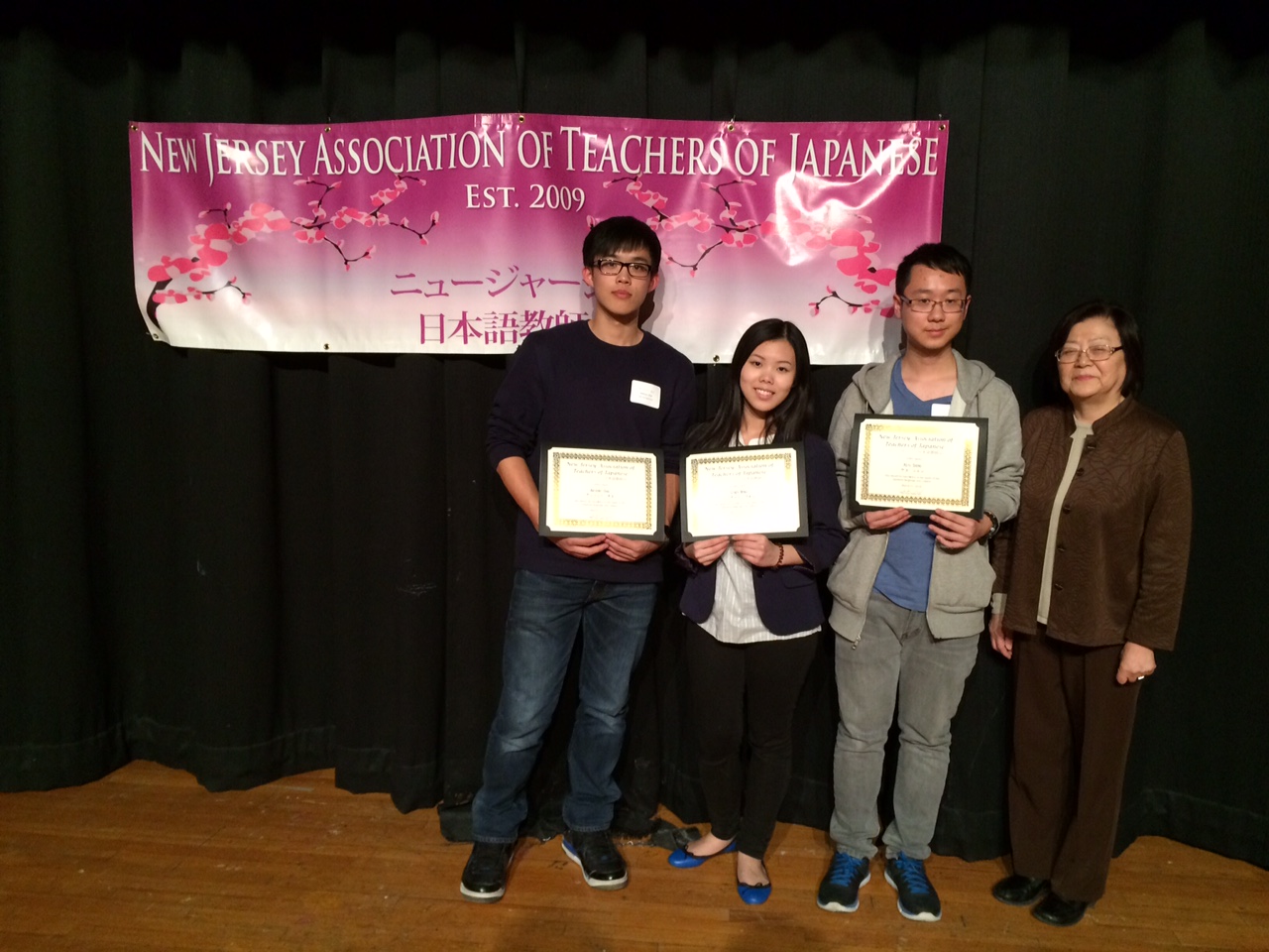 (Cranford, NJ—March 11, 2016) New Jersey Association of Teachers of Japanese (NJATJ) President Yoko Fukuda has awarded High Tech’s Anthony Chae and Keyu Sheng, both residents of Harrison, and North Bergen resident Cindy Wong this year’s Japanese Language and Culture Study Award, announced Dr. Joseph Giammarella, Principal of High Tech High School.